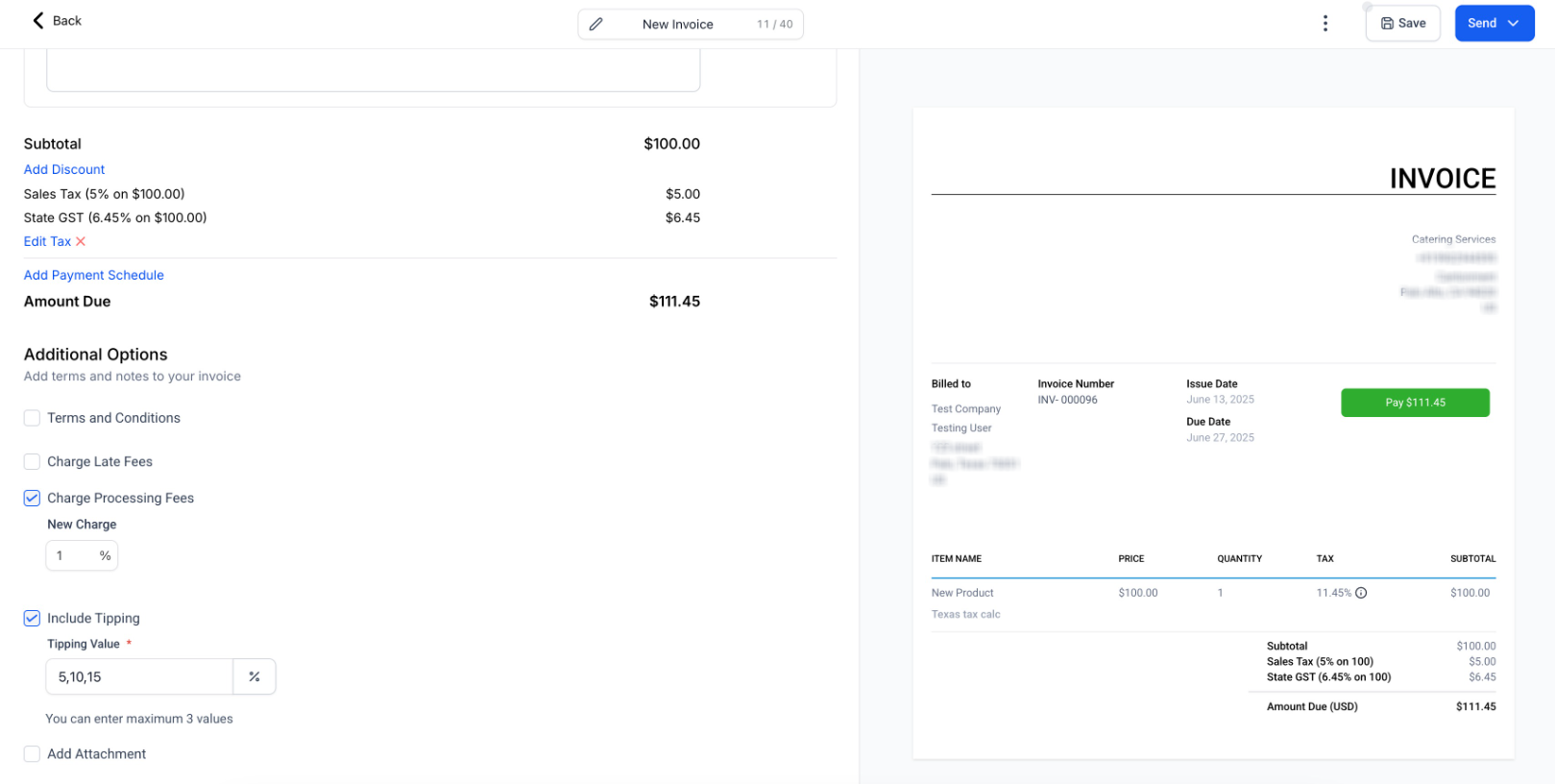 • Businesses can apply this fee selectively to Invoices, Funnels, Payment Links, Forms and Surveys using checkboxes.