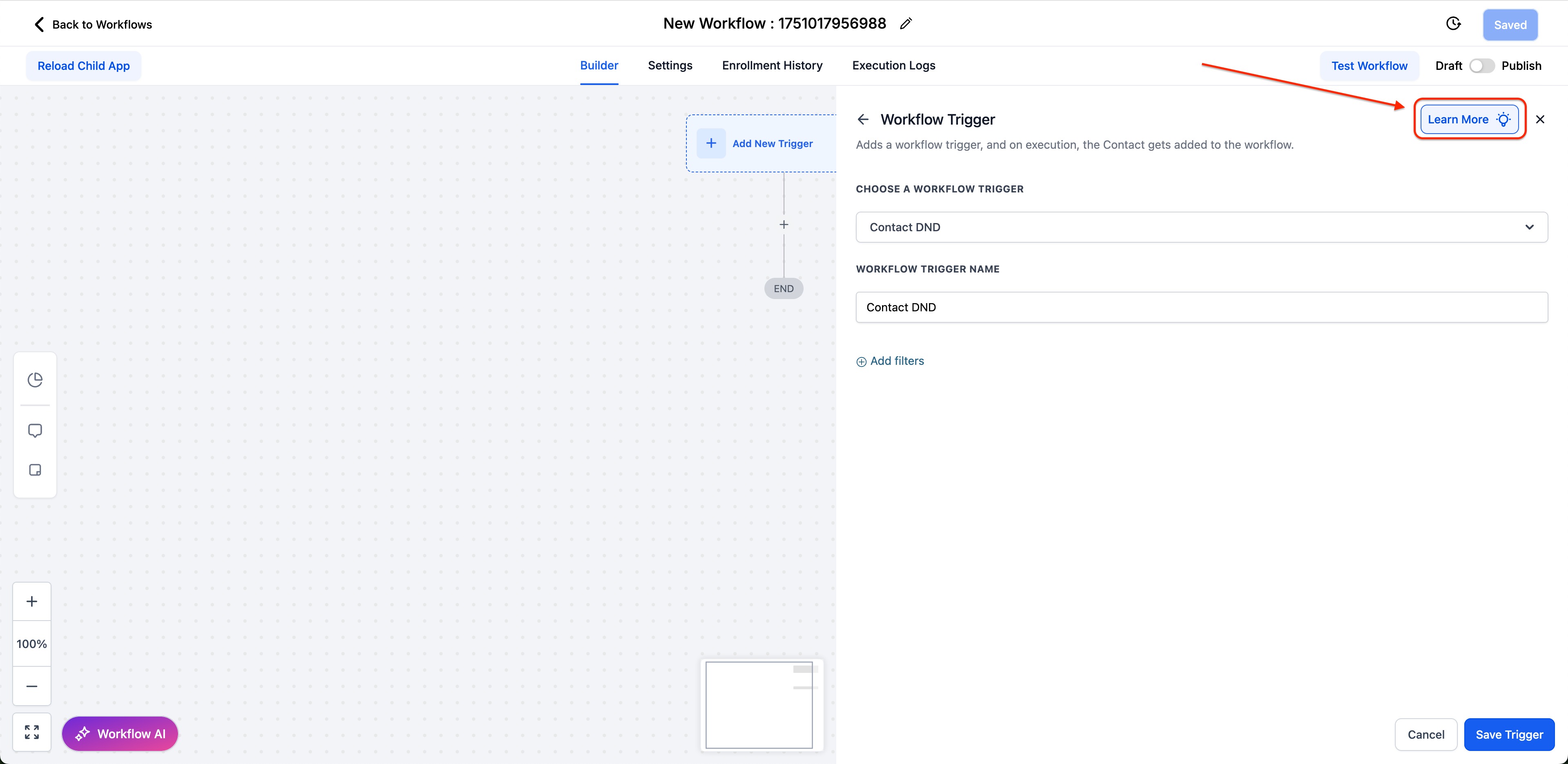 The Learn More button appears automatically in all trigger and action configuration panels. Simply click it whenever you need guidance on how a feature works or how to configure it properly.