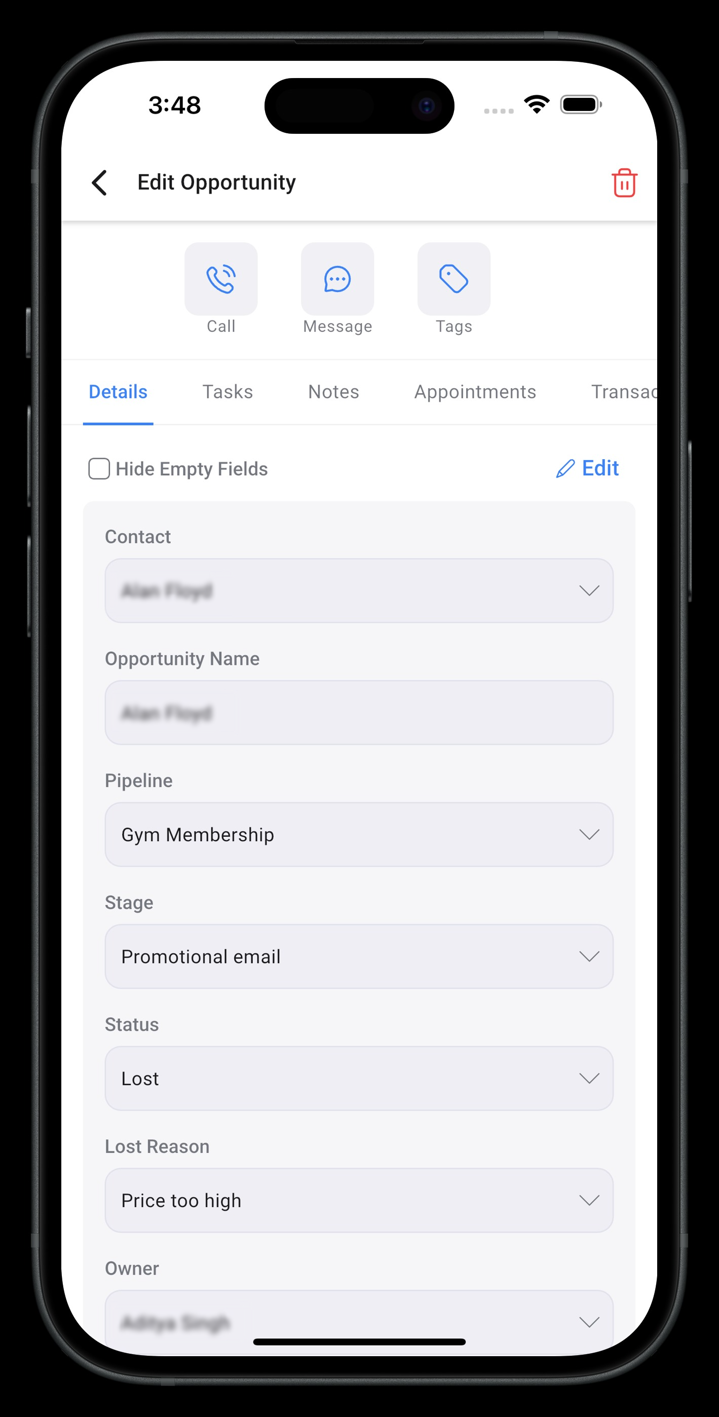 - Use the top quick actions (call, message, tag) or switch between tabs — Details, Tasks, Notes, Appointments, Transactions to manage everything in one place - Edit info, add updates, and track activity seamlessly without leaving the opportunity view