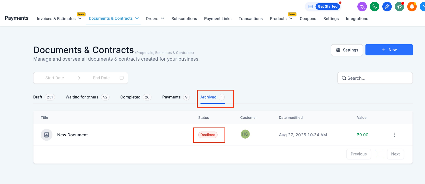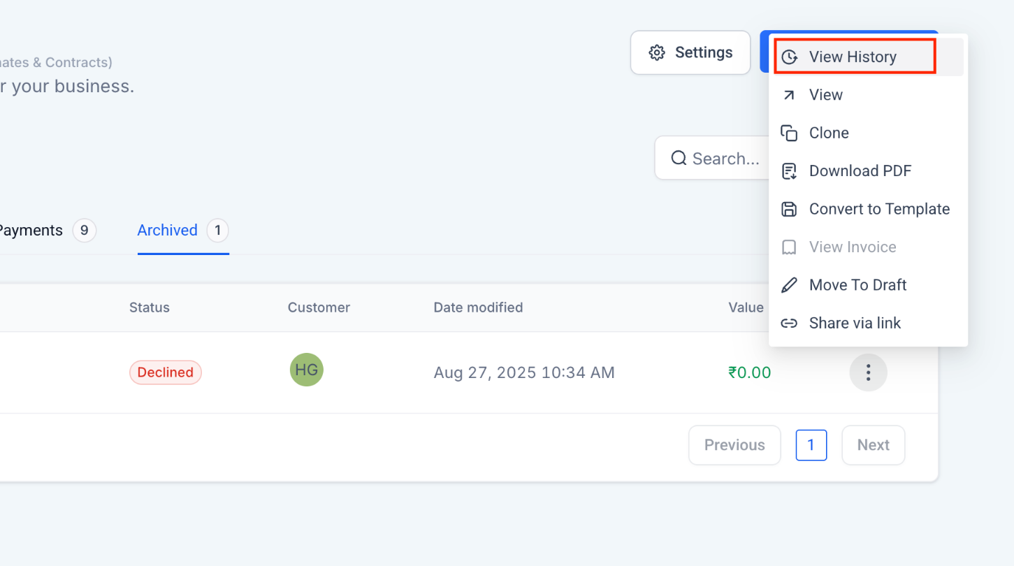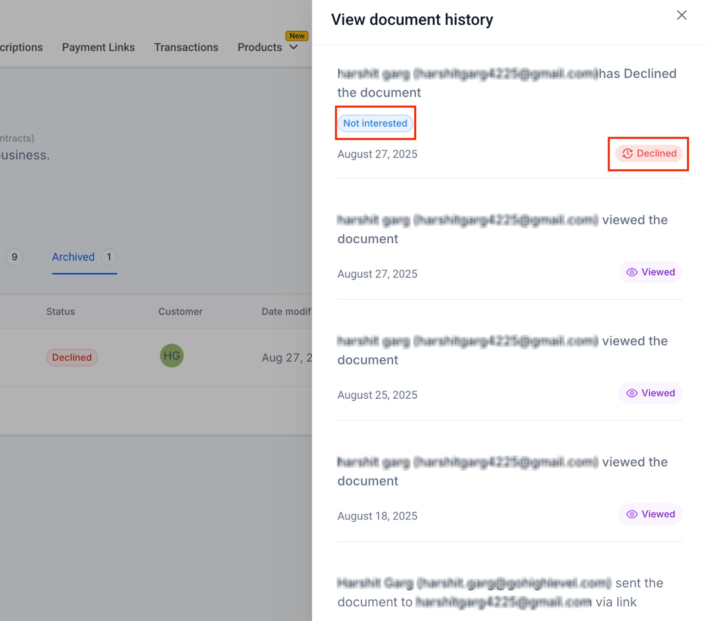 Go to Documents & Contracts → Archived to see all declined docs. Open View History for detailed feedback (reason, timestamp, recipient).