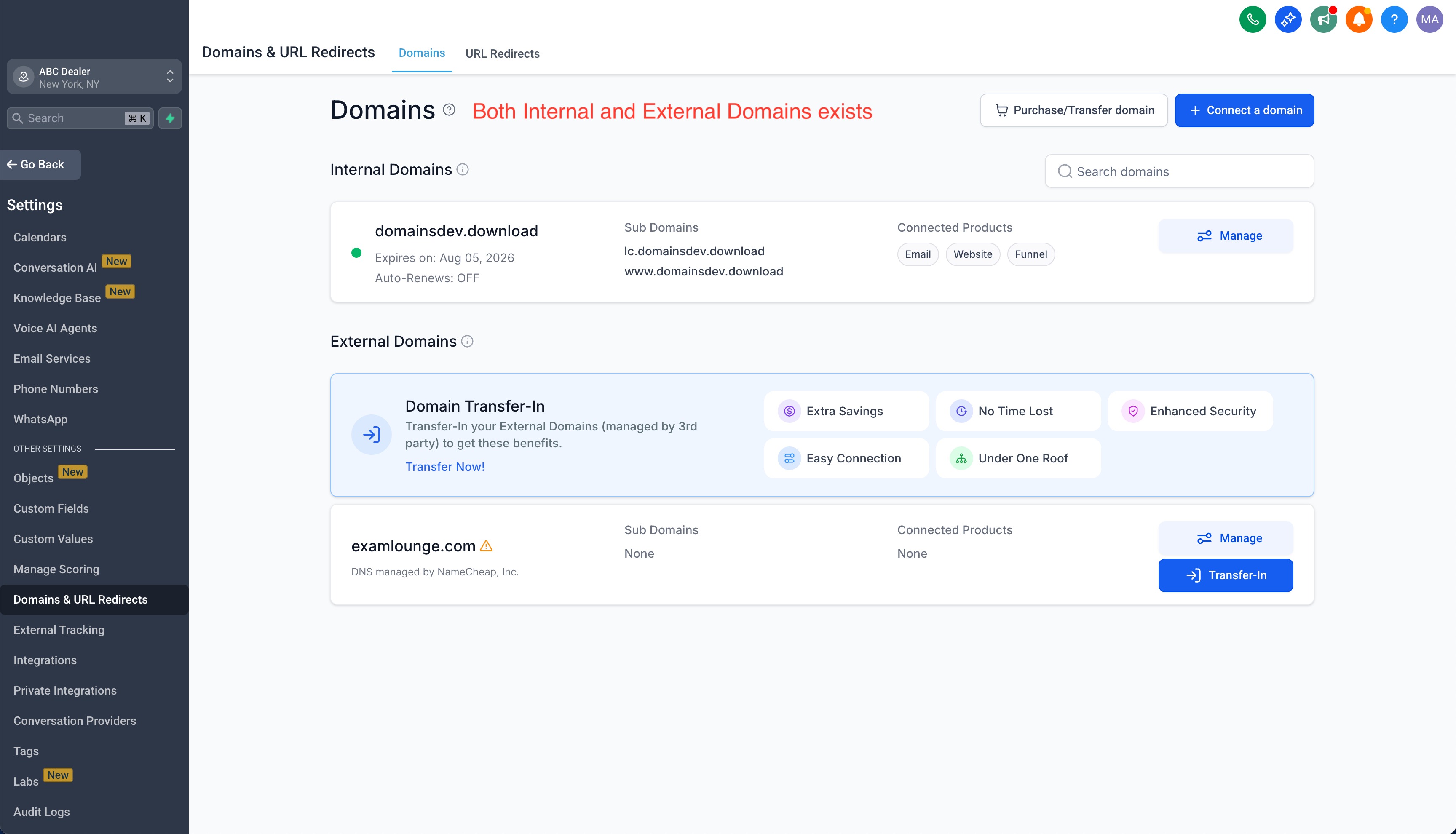 - Both internal and external domains:A transfer-in banner appears alongside external domains to encourage consolidation.