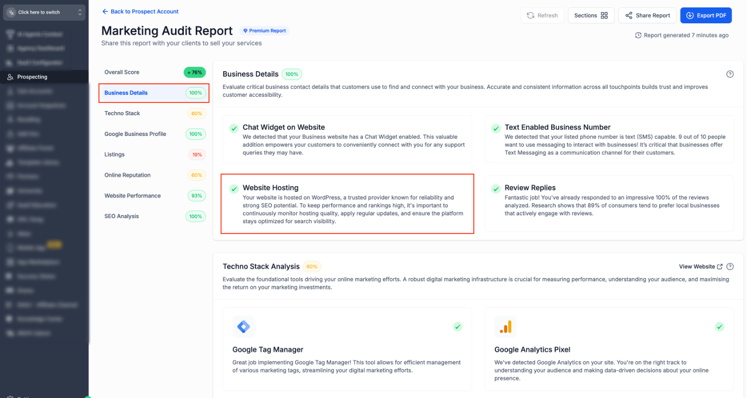 Your Marketing Audit Reports just got more flexible and accurate. You can now detect multiple website hosting providers—not just WordPress—and decide exactly how to present this to your prospects.