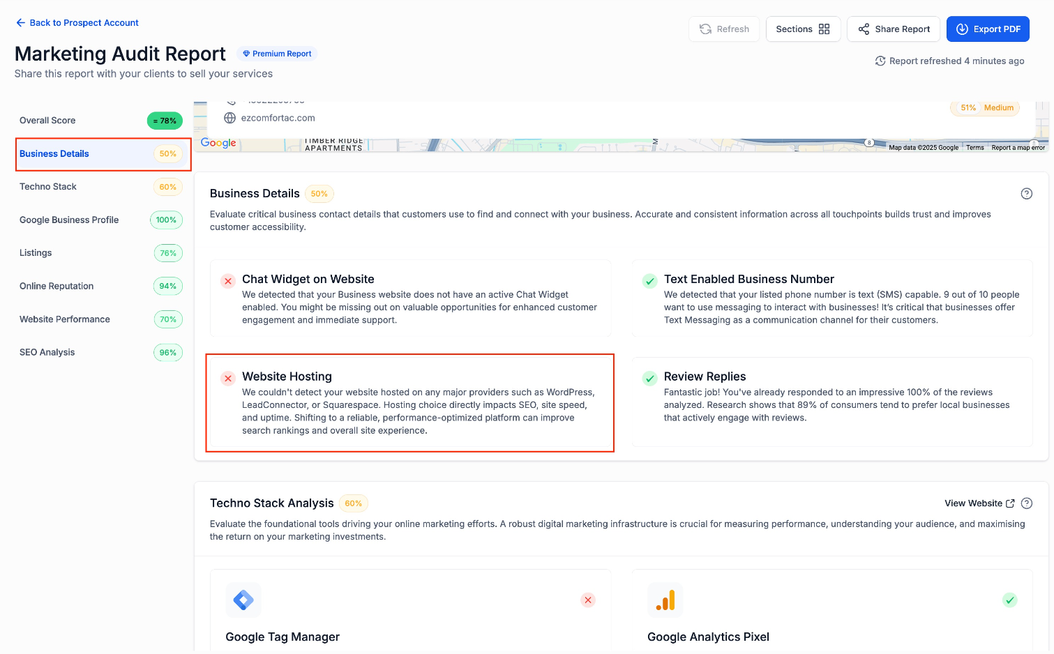 - Prospects can now see where their site is hosted and understand how hosting impacts SEO, speed, uptime, and reliability.