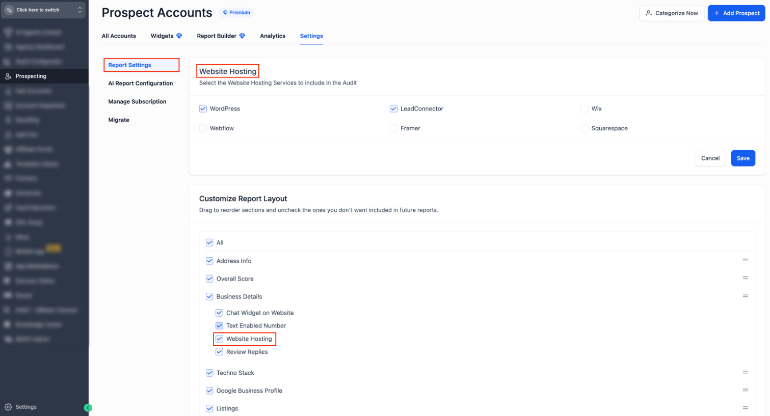 - Account Level Prospecting: Configure under Prospecting → Report Settings → Website Hosting.