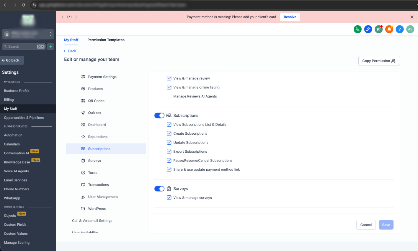 - Existing 'Payments' permissions like 'Refund Transactions' and 'Manage Subscriptions' are now moved into their respective new sections.
