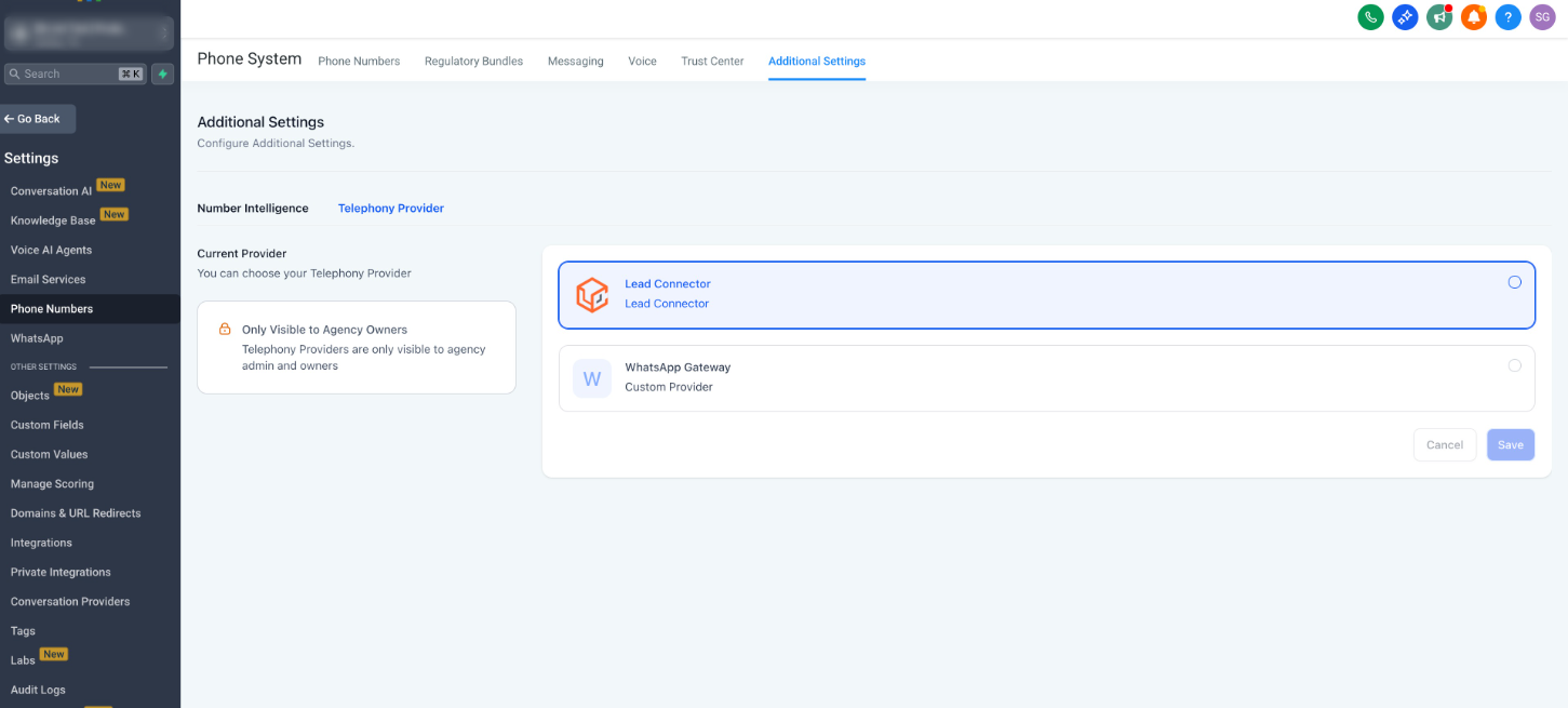 - Additional Settings- Advanced features like number intelligence and telephony provider setup