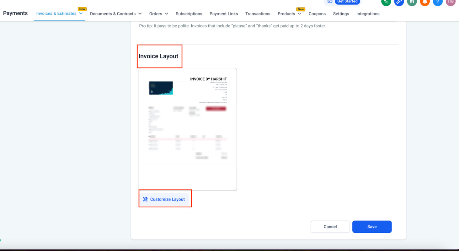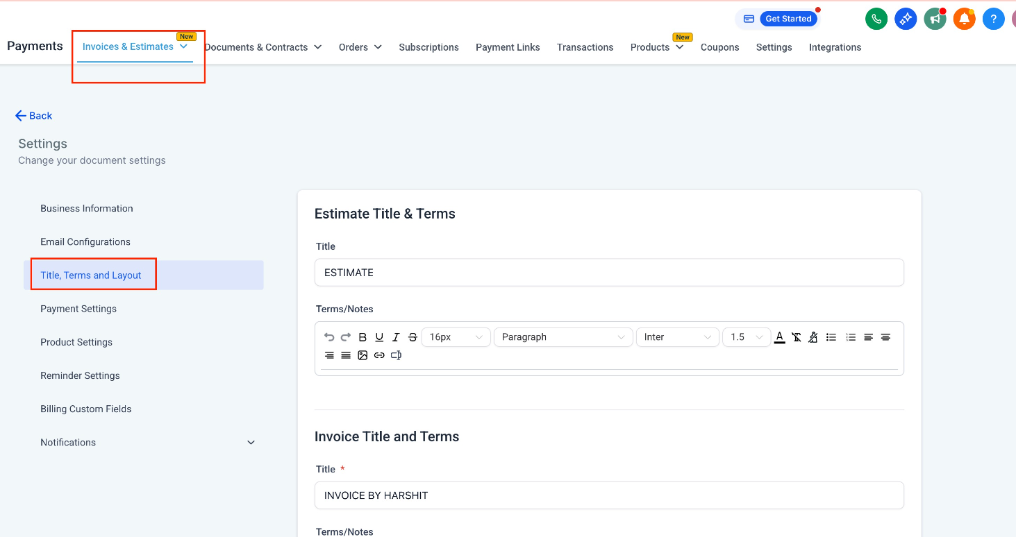 - Navigate to Payments → Invoices & Estimates → Settings → Title, Terms, and Layout.
