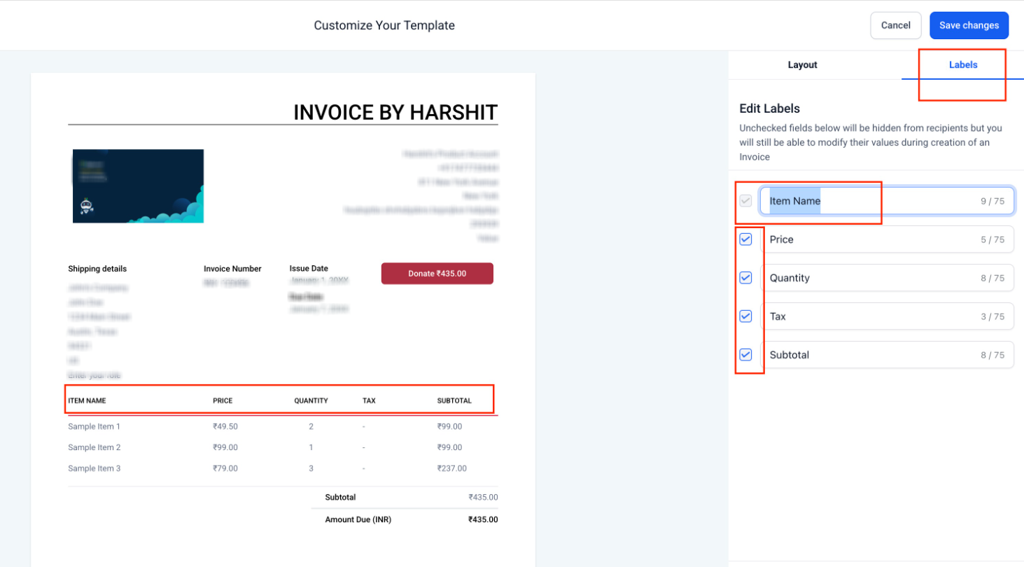 - Labels: Edit column labels like Item Name, Price, Quantity, Tax, Subtotal, or choose to hide them.