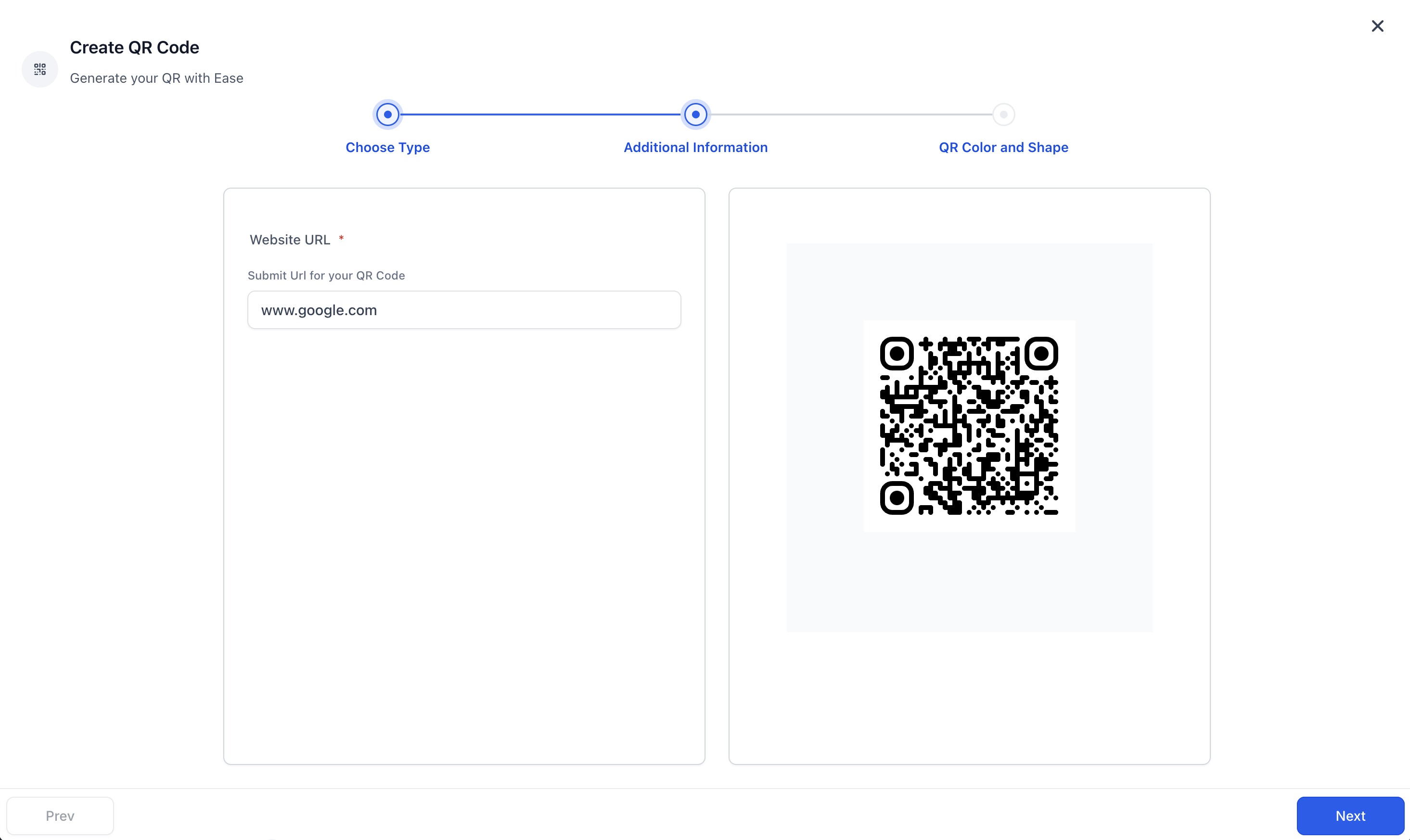 Create QR Code: Go to Sites > QR Codes > Create QR Code. Add Name and select QR Type as Website and click on Next.