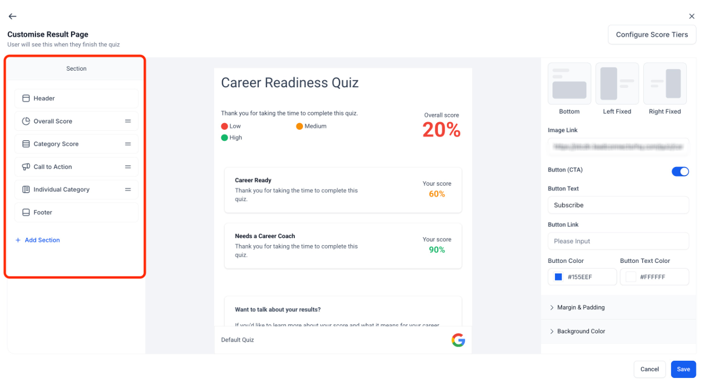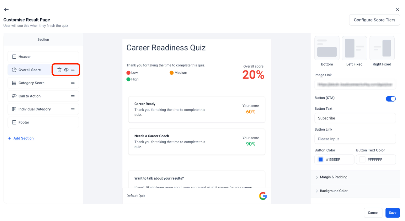 - Score tiers are now configured at a global level, and all scoring must fall within a 0–100 range. This ensures consistency across all quizzes and improves comparability.