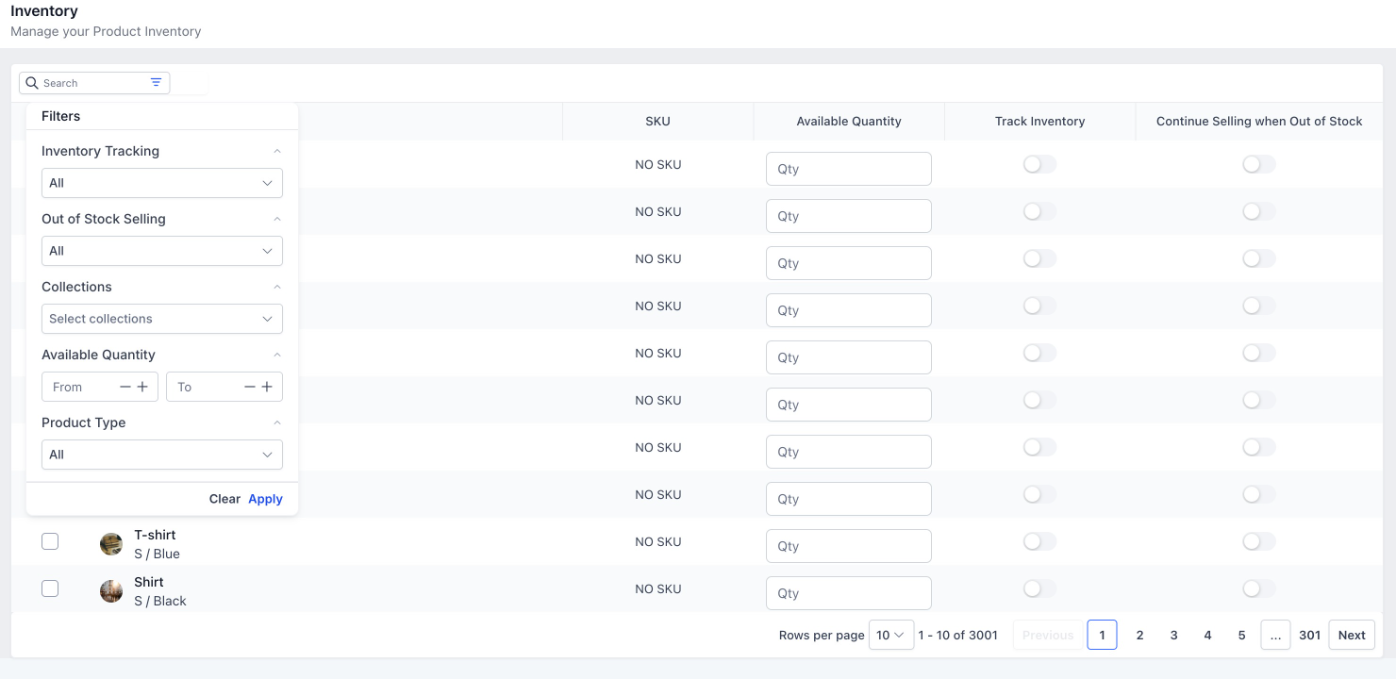 - Search and advanced filters (Inventory Tracking, OOS Selling, Collections, Quantity range, Product Type).