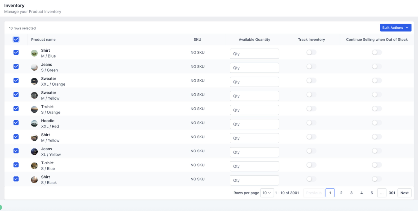- Clear tabular view with Product, SKU, Available Quantity, Track Inventory, Continue Selling when Out of Stock.