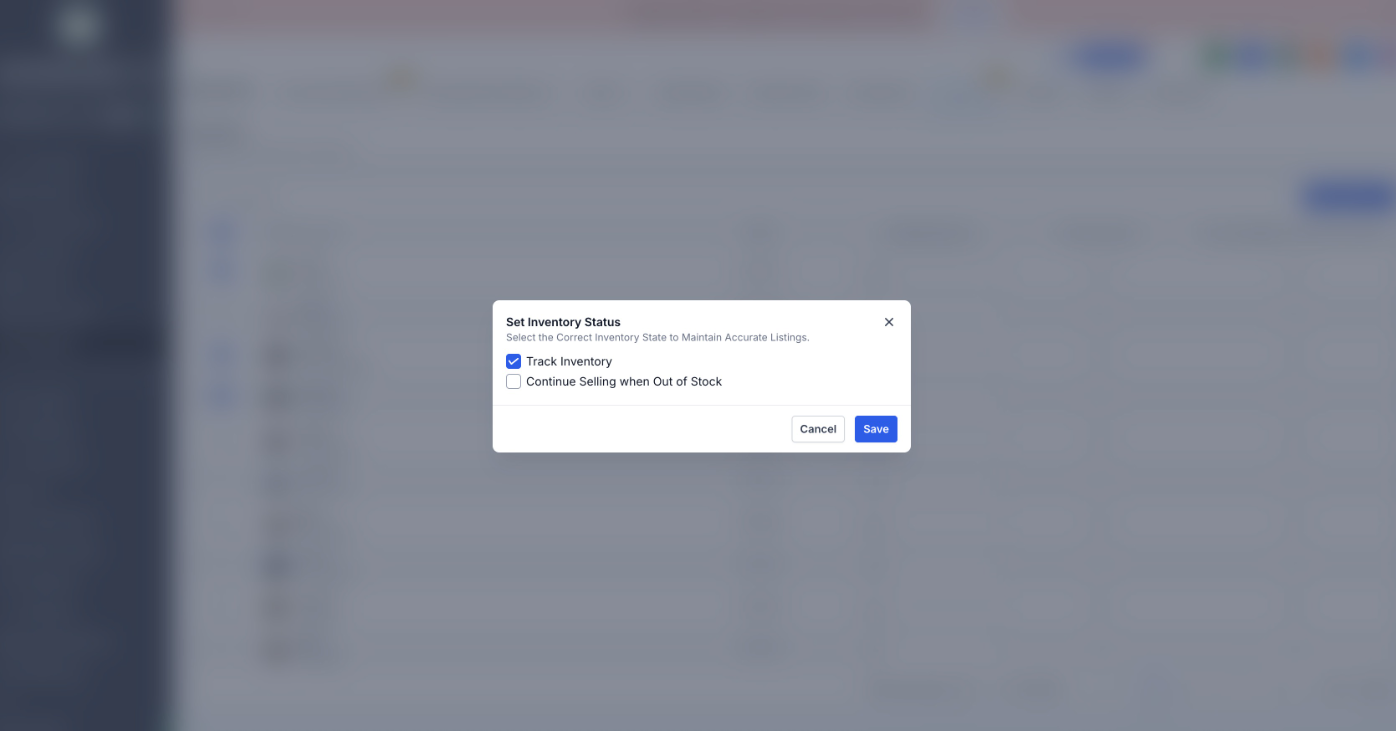 - Set Inventory Status→ ToggleTrack Inventoryand/orContinue Selling When Out of Stock, then save.