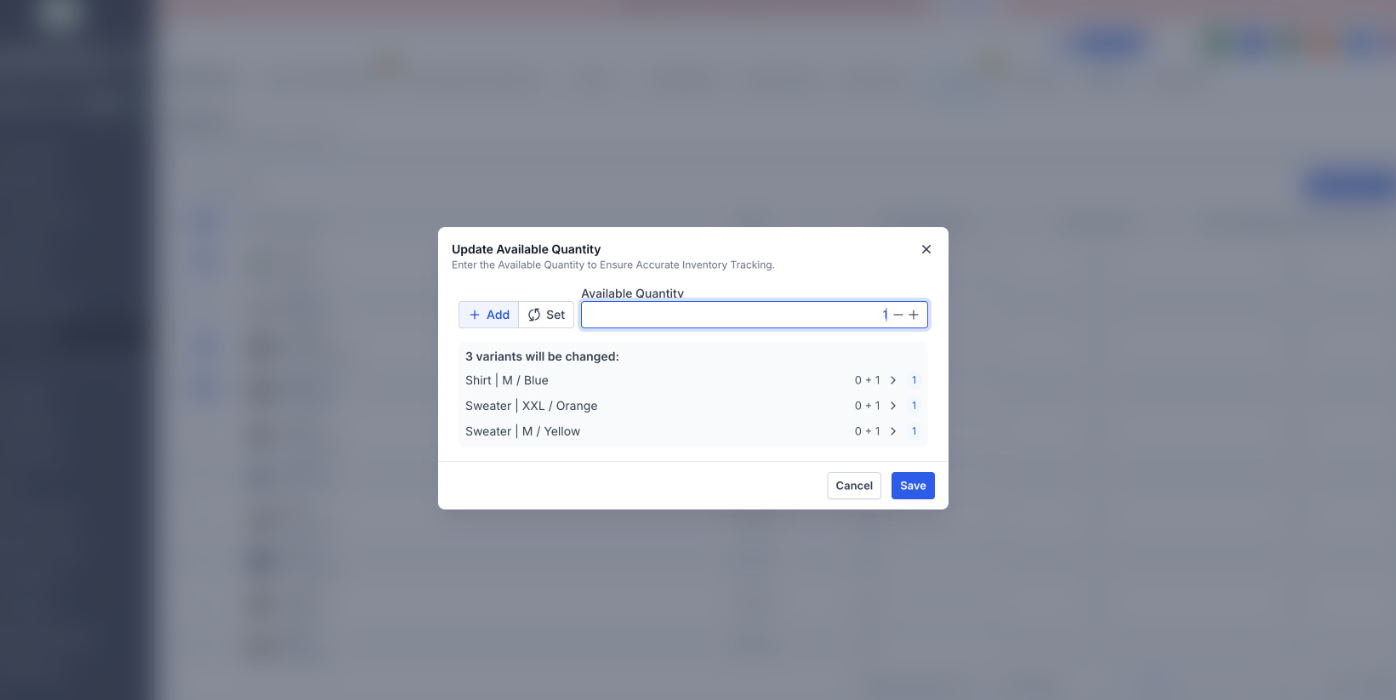 - Update Available Quantity→ Enter value, choose Add or Set, preview, and save.