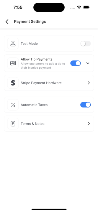 - To enable Automatic Taxes for your invoice, tap the icon on the top-right corner of the screen to open Settings, and toggle on Automatic Taxes.
