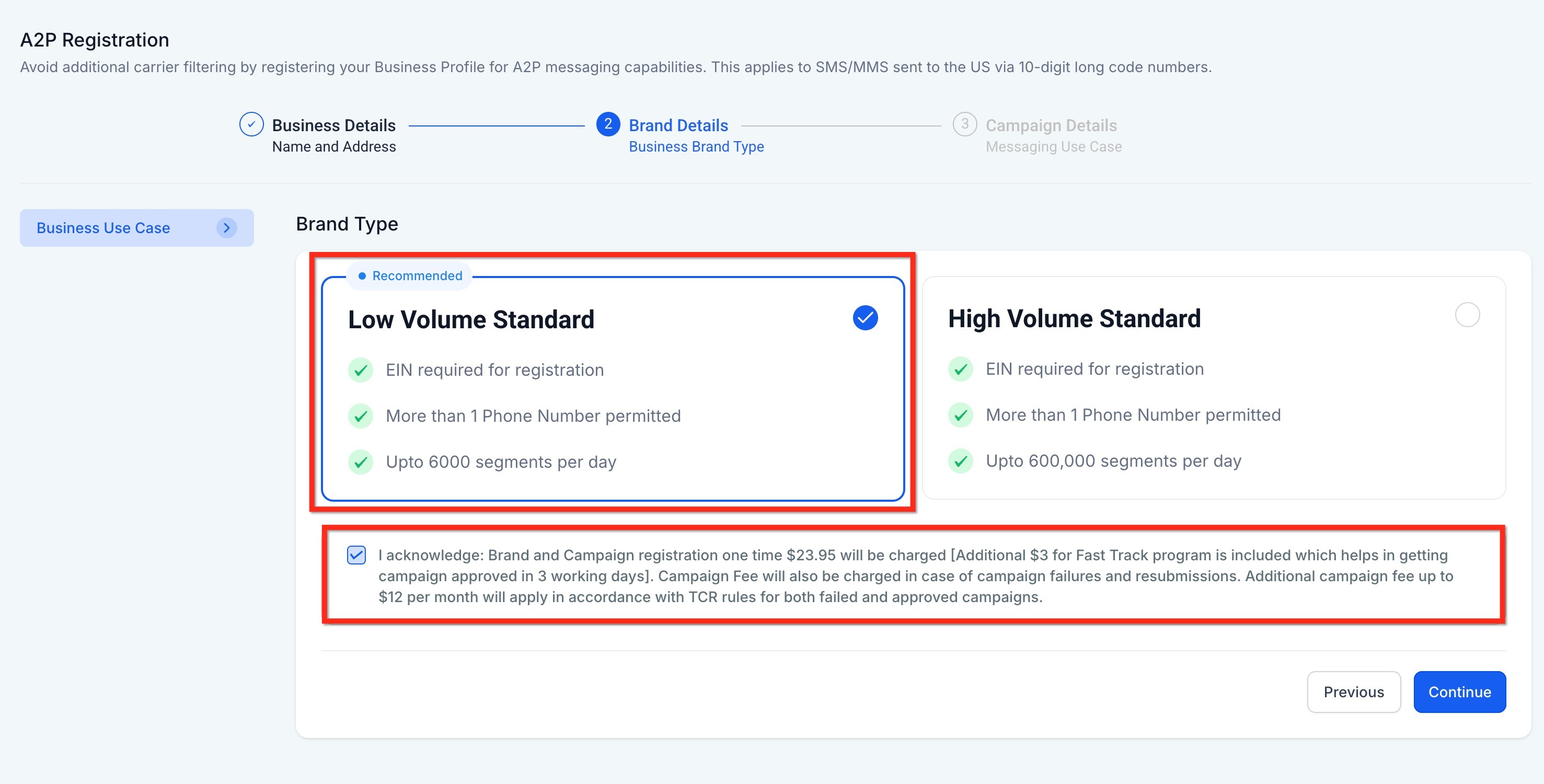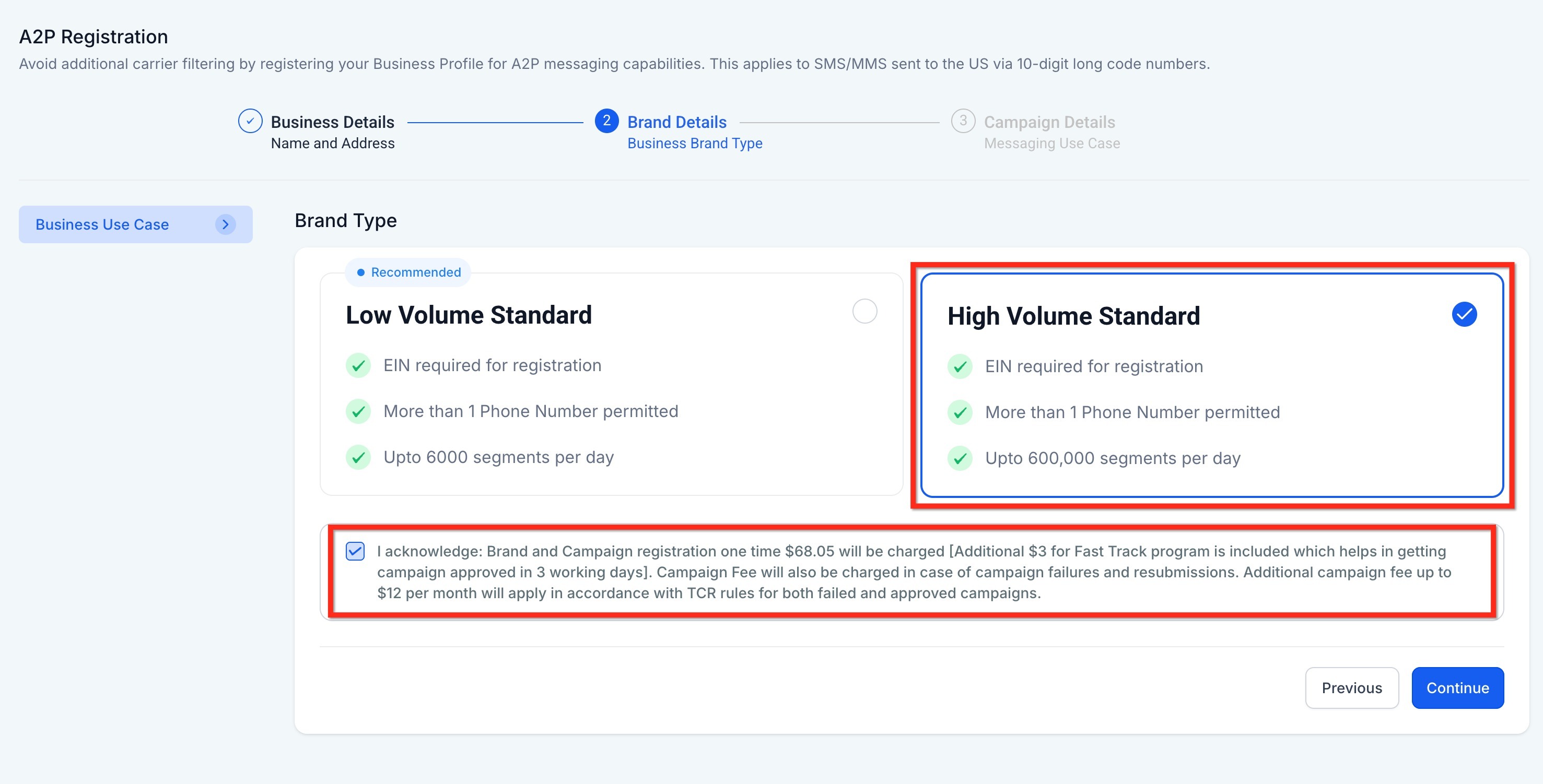 The Business Brand Type will be automatically set to "Low/High Volume Standard" based on the responses provided under Profile Needs.