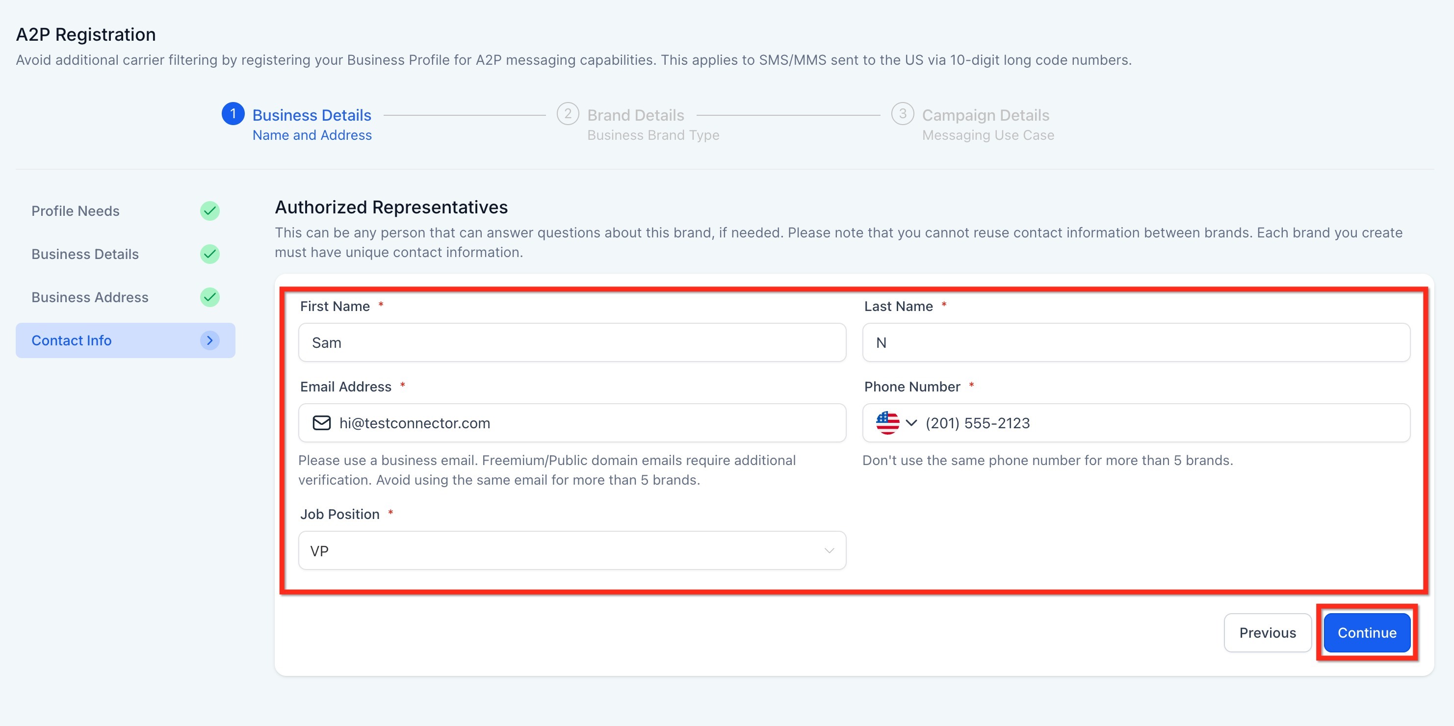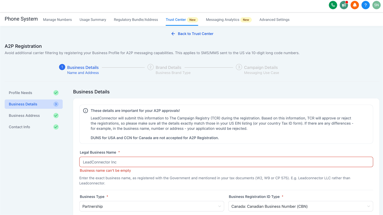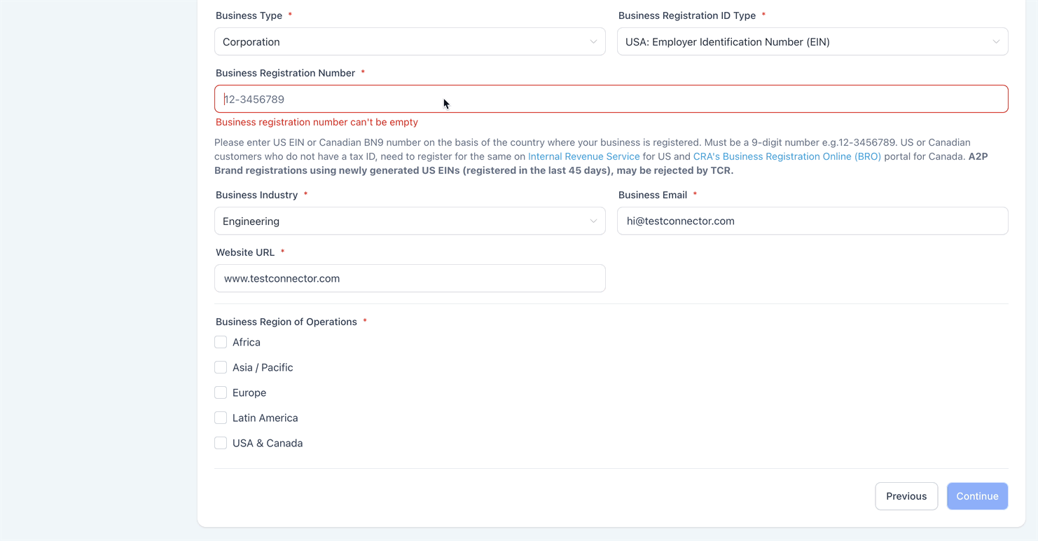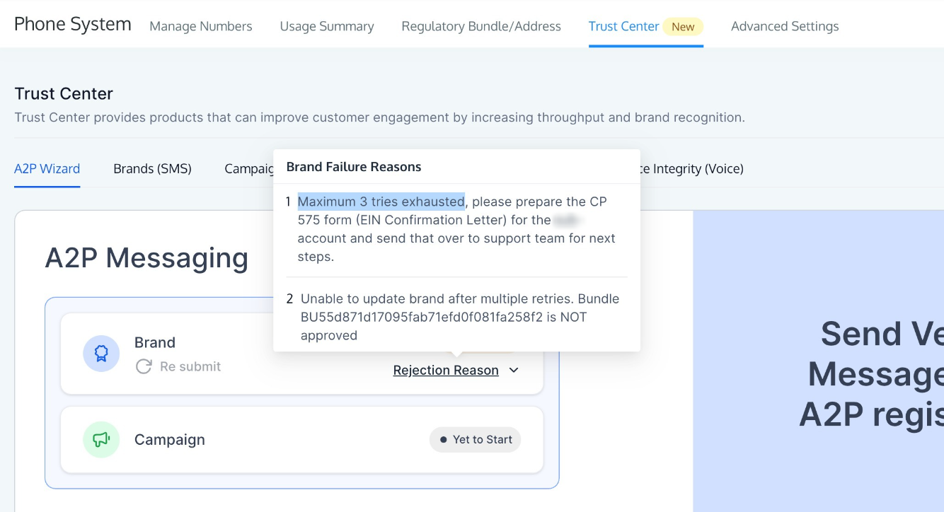 Important: A2P Brand registrations using newly generated US EINs (registered in the last 45 days), may be rejected by TCR.