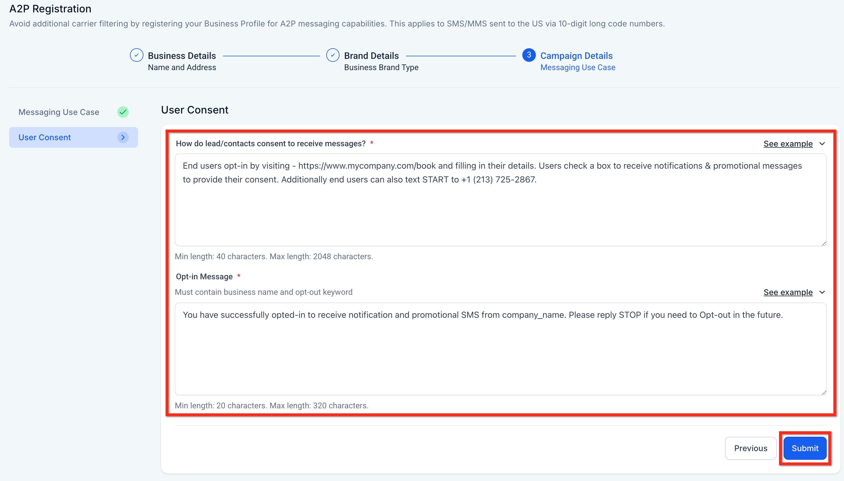 To comply with carrier regulations, you’ll need to provide details on how your contacts give consent to receive messages and what your opt-in message looks like. Follow these steps: