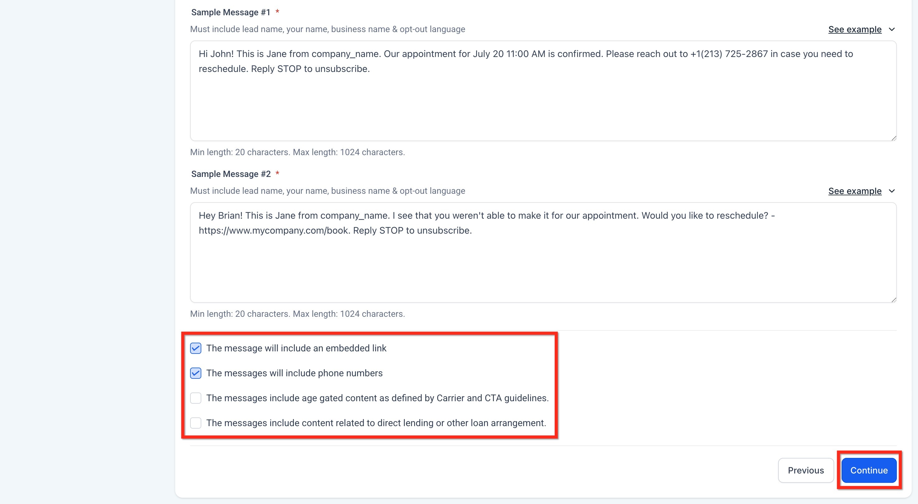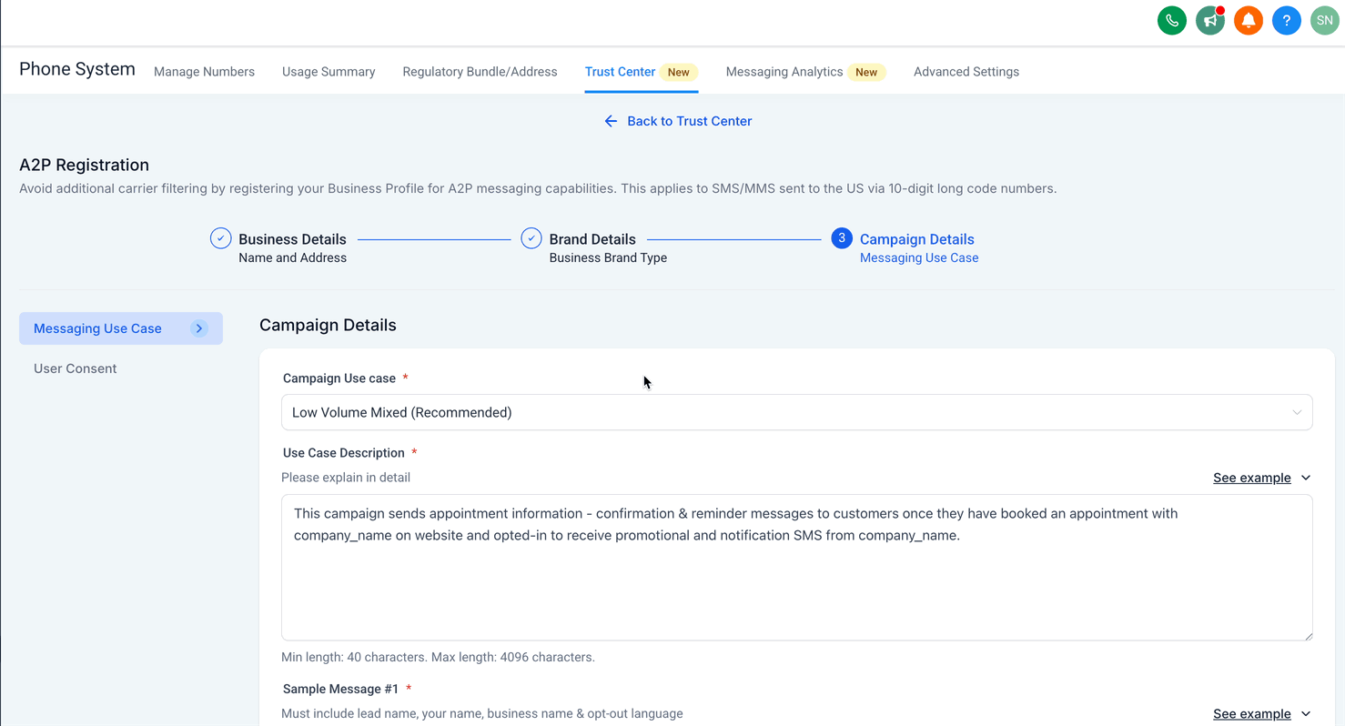 Note: If you have an EIN but use a different brand name, include “We are doing DBA as [Business_Name]” in the Campaign Use Case Description. You can register up to 10 brands per EIN.- Add Sample Message #1 & #2