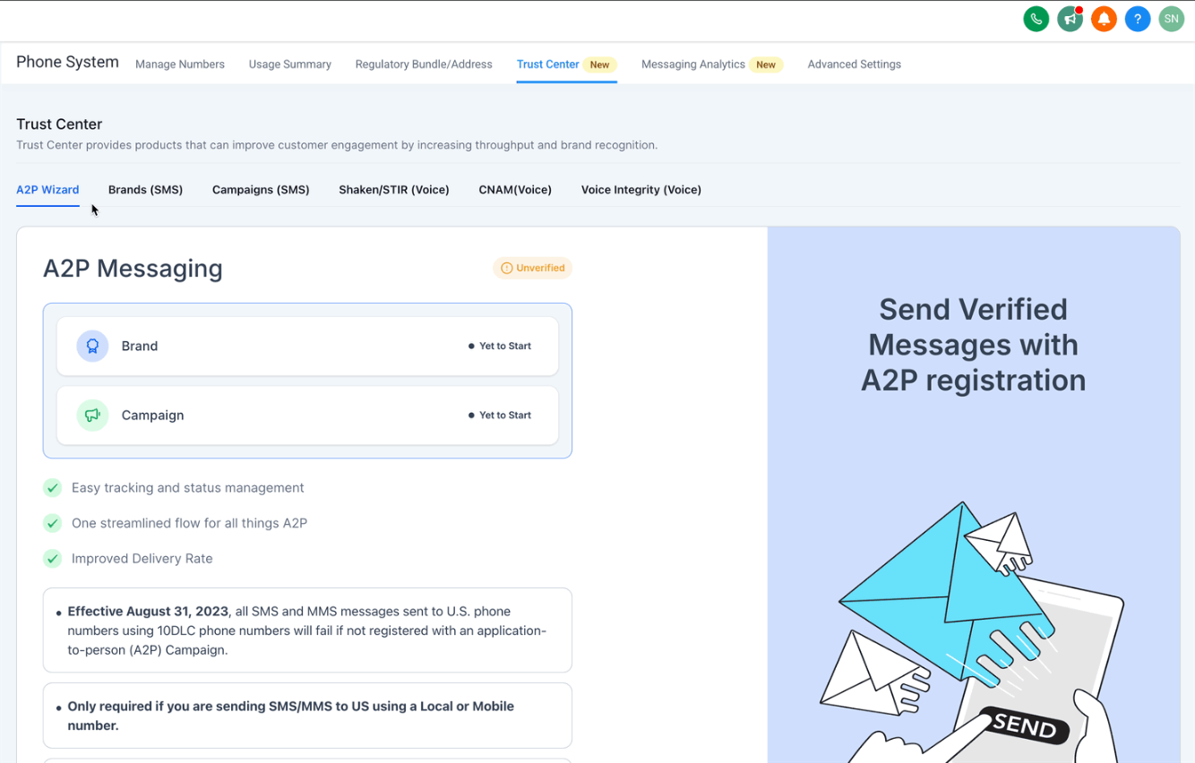 - Click on the Start Registering Now button under A2P Wizard tab.