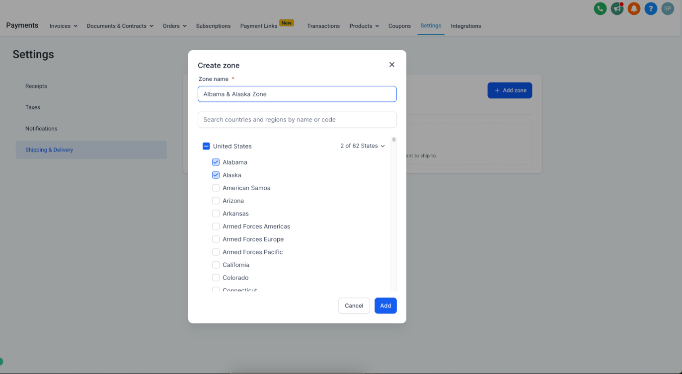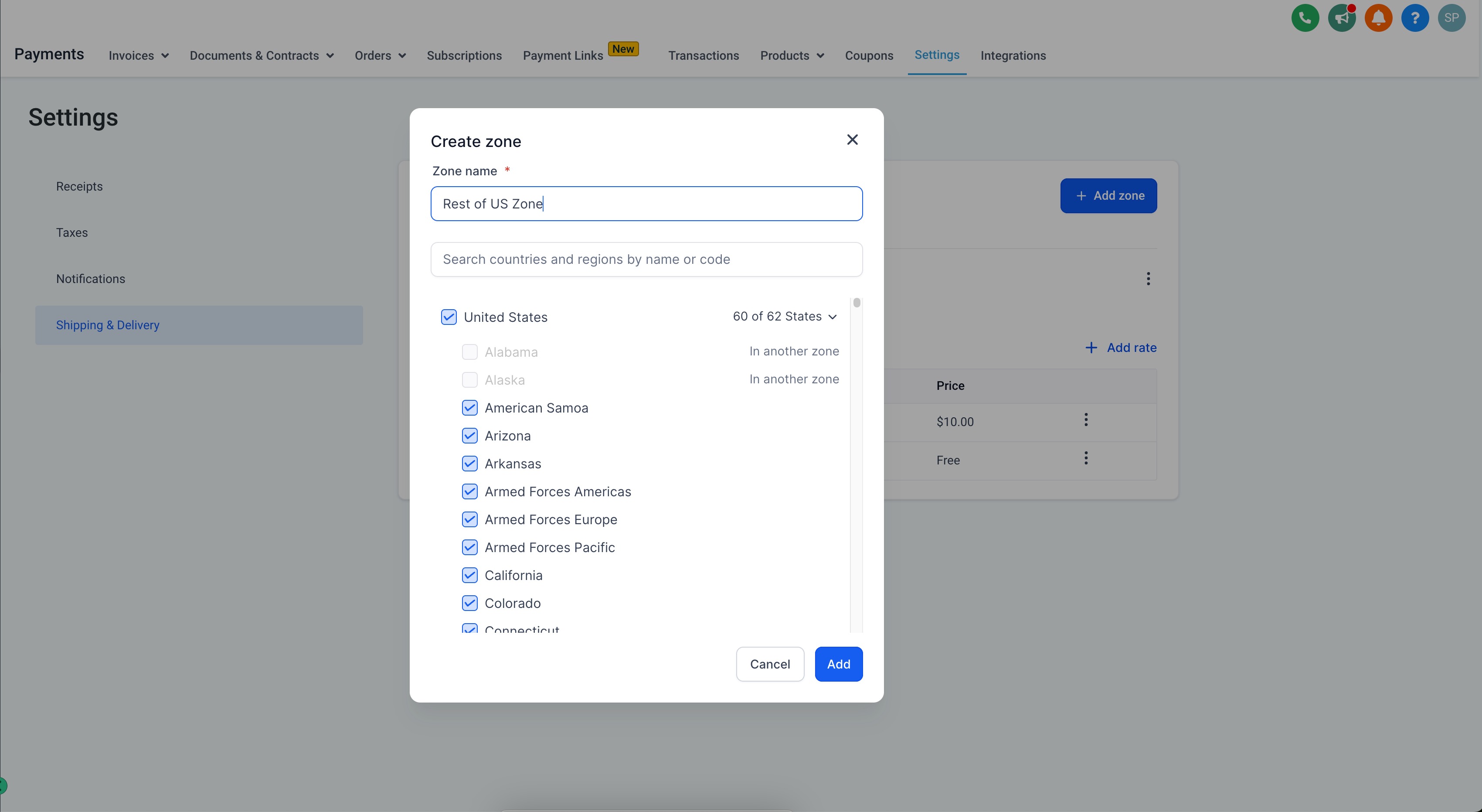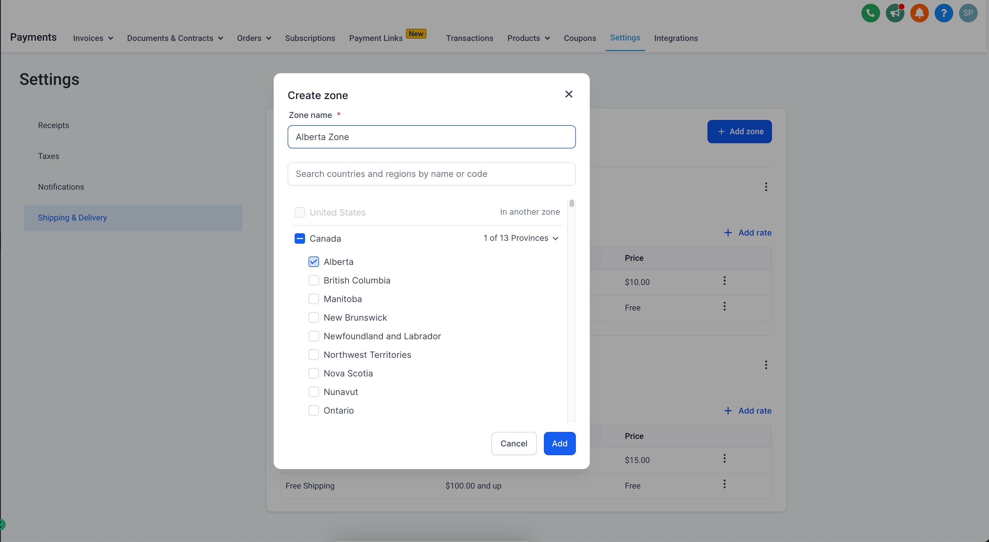 - Once a states/ province is added in a zone, it can't be added to another zone.