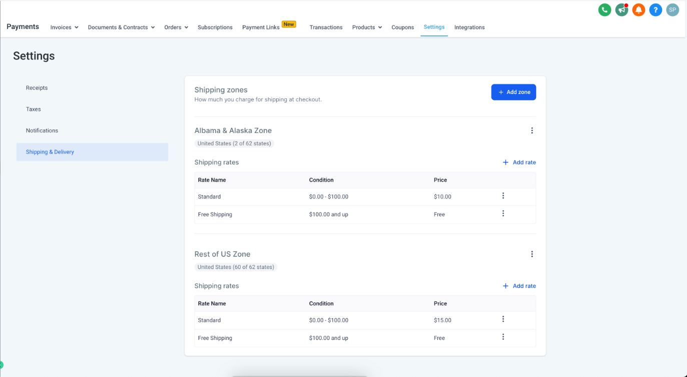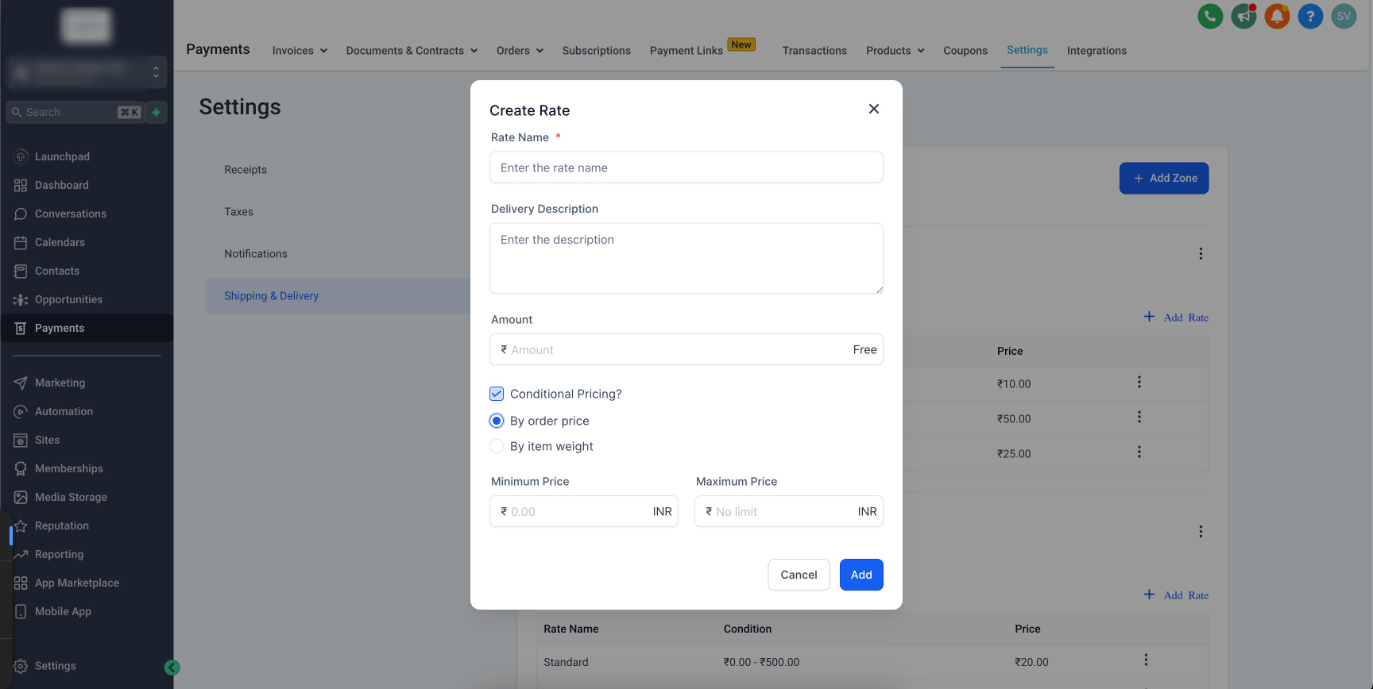 - Go to Account > Payments > Settings > Shipping & Delivery > Add Rate > Select conditional pricing.