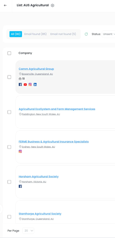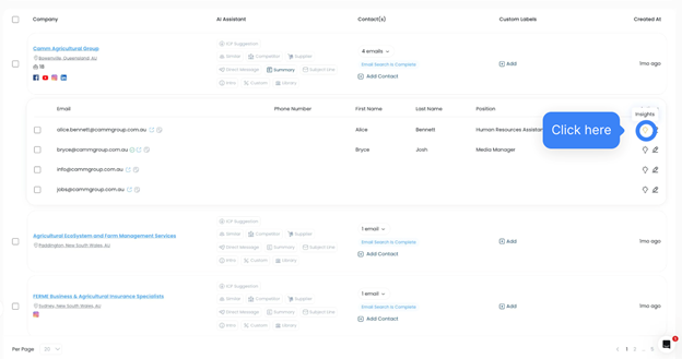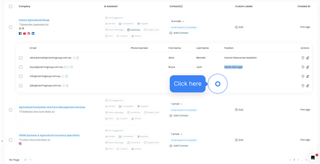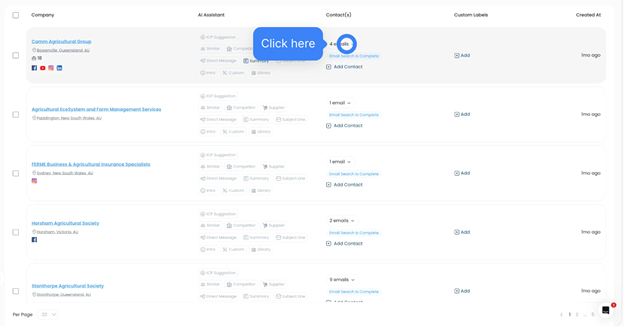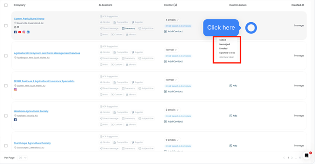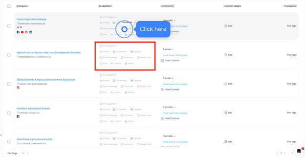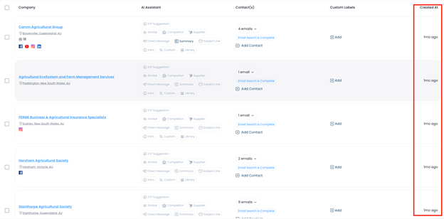 The Lead Generation Tool search results provide detailed information in several key columns that help you make informed sales decisions. This guide explains each column—Company, AI Assistant, Contacts, Custom Labels, and Created At—and how to leverage them for outreach and strategy.